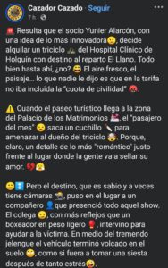 Un hecho insólito sacudió recientemente la tranquilidad de la ciudad de Holguín, cuando un ciudadano identificado como Yunier Alarcón protagonizó un episodio que mezcló lo absurdo con lo delictivo. De acuerdo a la plataforma oficialista Cazador Cazado en Facebook, el individuo decidió alquilar un triciclo perteneciente al Hospital Clínico de Holguín, con destino al reparto El Llano, en lo que parecía ser un simple viaje de rutina.