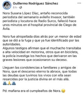 Home ActualidadCubaPeriodista Nora Susana López Díaz fallece tras atropello