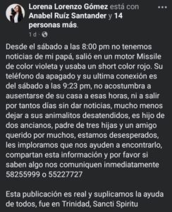 En redes sociales circula un llamado urgente de búsqueda emitido por Lorena Lorenzo Gómez, quien solicita la colaboración de la población para encontrar a su padre Giovanni, desaparecido desde el pasado sábado a las 8:00 p.m. en el municipio de Trinidad, provincia de Sancti Spíritus.