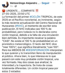 La formación del primer ciclón tropical de la temporada 2025 en el Pacífico nororiental es prácticamente un hecho, según la última actualización del Centro Nacional de Huracanes (NHC). Aunque aún no se ha declarado oficialmente ciclón tropical debido a la falta de una circulación bien definida, la probabilidad de que se forme es “casi 100%”, lo que indica una alta certeza, aunque sin eliminar la incertidumbre inherente a los fenómenos meteorológicos.