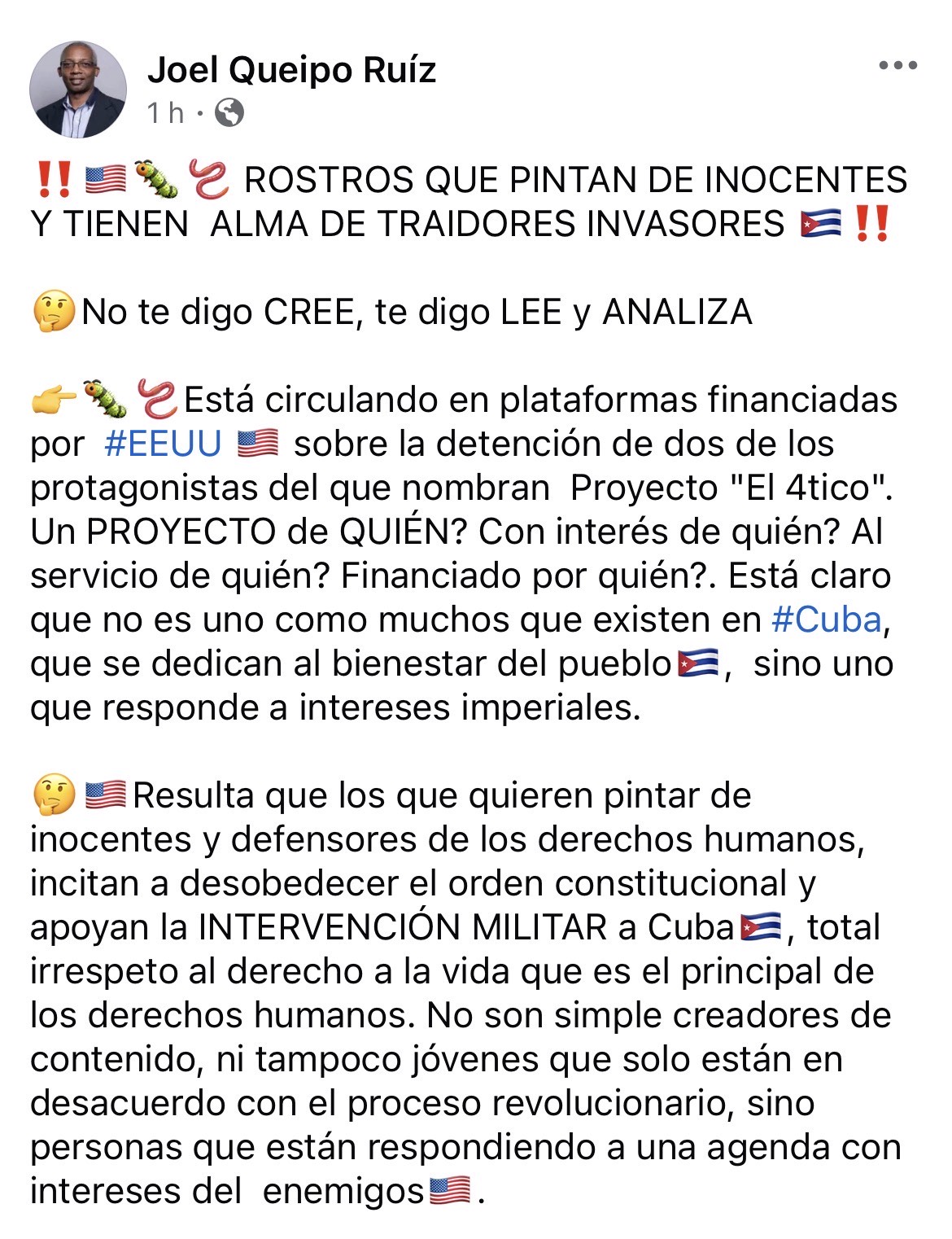 Queipo Ruiz, con su «No te digo CREE, te digo LEE y ANALIZA», insiste en que estos muchachos incitan a la desobediencia constitucional y apoyan intervenciones militares. ¿Pruebas? Ninguna pública. En cambio, su post con hashtags como #HonorHolguinero y #ACubaSeRespeta convierte la crítica en traición, equiparándola a «vender la patria». Esta narrativa oficial es el manual perfecto para justificar detenciones arbitrarias. Los jóvenes de El 4tico fueron sacados de sus casas sin explicaciones, recluidos en estaciones policiales y ahora enfrentan cargos nebulosos solo por pensar diferente.