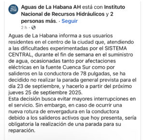 La empresa Aguas de La Habana ha decidido posponer la parada general del sistema de agua, originalmente prevista para el martes 23 de septiembre, y trasladarla para el jueves 25 de septiembre de 2025.
