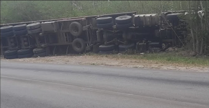 El accidente ocurrió luego de que el pesado vehículo se desestabilizara y volcara lateralmente. Testigos y fotos compartidas en redes sociales muestran el remolque volteado a una orilla de la carretera.