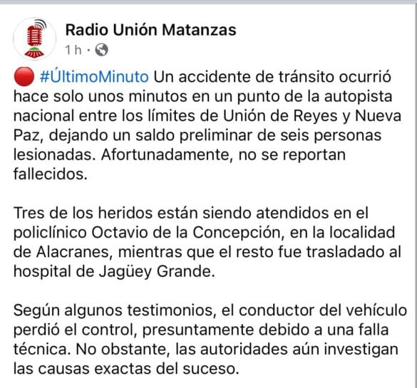 Un nuevo accidente de tránsito se registró hace apenas unos minutos en un tramo de la Autopista Nacional, entre los límites de Unión de Reyes y Nueva Paz, dejando un saldo preliminar de seis personas lesionadas. Afortunadamente, no se reportan fallecidos hasta el momento. Tres de los heridos reciben atención médica en el policlínico Octavio de la Concepción, ubicado en Alacranes, mientras se coordina la asistencia para los demás afectados. Según información ofrecida por Radio Unión Matanzas , el conductor habría perdido el control del vehículo debido a una posible falla técnica, aunque las autoridades continúan investigando las causas exactas del incidente.