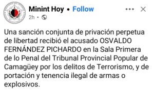 El Tribunal Provincial Popular de Camagüey impuso privación perpetua de libertad a Osvaldo Fernández Pichardo, declarado culpable de los delitos de terrorismo y portación y tenencia ilegal de armas o explosivos. La decisión judicial fue emitida por la Sala Primera de lo Penal, en cumplimiento de la causa No. 6 de 2025, según informó el perfil oficialista Minint Hoy en la red social Facebook.