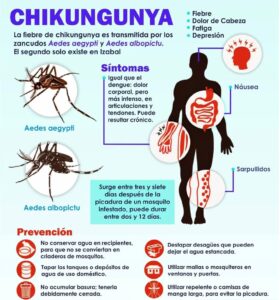 El chikungunya es una enfermedad transmitida por mosquitos del género Aedes (como Aedes aegypti y Aedes albopictus) y se caracteriza por fiebre alta, dolores articulares severos, dolor de cabeza, dolores musculares y erupciones cutáneas. En muchos casos, los síntomas articulares pueden persistir incluso después de superada la fase aguda.