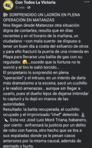 Sin embargo, en esta ocasión la fortuna no estuvo de su lado. El dueño del inmueble lo sorprendió en plena acción, frustrando el intento de robo. Según los reportes del perfil oficialista Con Todos La Victoria, el intruso, identificado como José Luis Moré Triana, residente en La Habana, intentó intimidar al propietario con un cuchillo, aunque sin llegar a emplearlo. Lejos de dejarse amedrentar, el afectado logró reducirlo y entregarlo a las autoridades competentes.