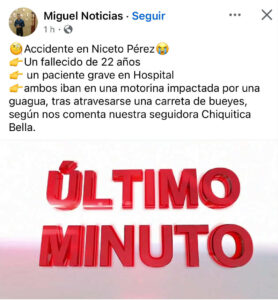 De acuerdo con reportes preliminares compartidos por el perfil de Facebook Miguel Noticias, los dos muchachos viajaban en una motorina cuando, al atravesarse en la vía una carreta tirada por bueyes, se produjo una colisión con un ómnibus que transitaba por la carretera. El impacto resultó fatal para uno de los ocupantes del pequeño vehículo, mientras que el otro fue trasladado de urgencia en condición grave.