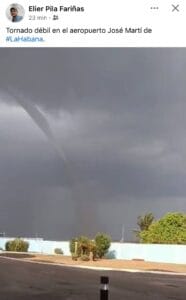 Se reporta tornado débil en el aeropuerto José Martí de La Habana”, publicó Elier Pila Fariñas en su perfil oficial, acompañando la información con una imagen del fenómeno.