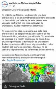 A medida que la baja extratropical se desplace hacia el sudeste de los Estados Unidos en los próximos días, el frente frío asociado avanzará hacia el occidente de Cuba. Este movimiento traerá consigo un aumento en la probabilidad de precipitaciones fuertes, sobre todo en la región occidental de la isla, donde no se descarta la ocurrencia de tormentas locales severas. Estas tormentas pueden estar acompañadas de rachas de viento, descargas eléctricas e incluso la caída de granizo en algunos puntos según ha informado el Meteorólogo Raydel Ruisanchez en la página de Facebook del Instituto de Meteorología.