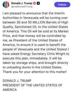 Trump anuncia que Venezuela entregará entre 30 y 50 millones de barriles de petróleo a Estados Unidos.