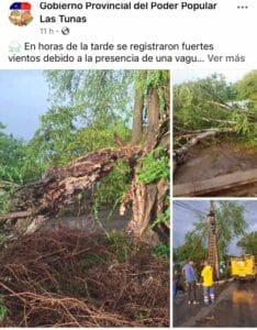 El pasado sábado en horas de la tarde, la localidad de Leyva, en el poblado de Delicias, municipio Puerto Padre, provincia Las Tunas, fue afectada por fuertes vientos asociados a una vaguada atmosférica, vientos del sudeste, altos valores de humedad y una marcada inestabilidad atmosférica. La estación meteorológica de Puerto Padre registró rachas de viento de hasta 76 km/h a las 17:12 hrs, acompañadas de intensas y abundantes descargas eléctricas, informó en su página de Facebook el gobierno de Las Tunas