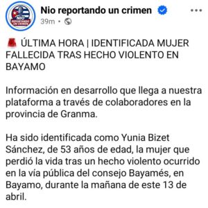 Durante la mañana de este 13 de abril, un hecho violento en la vía pública ha conmocionado a la población del consejo Bayamés, en la ciudad de Bayamo, provincia de Granma. De acuerdo con información en desarrollo que llega a nuestra redacción a través de colaboradores locales, una mujer perdió la vida tras ser atacada con arma blanca, en circunstancias que apuntan a un conflicto de carácter pasional.